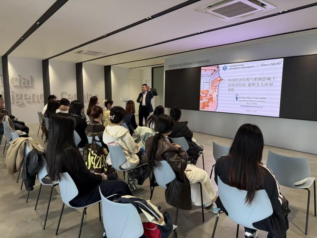 在淑明女子大学的学术交流环节,研习团师生深入参与了多场高水平专题讲座。肖树峰教授主讲的《韩国经济结构与财阀影响下的韩国经济:淑明女子应对策略》,从全球经济格局的宏观视角切入,详细解析了韩国经济的发展历程、产业结构特征及其在全球价值链中的定位。讲座聚焦三星、现代、SK等财阀集团对韩国经济生态的深远影响,引发了师生对新兴经济体发展模式的深入思考。
