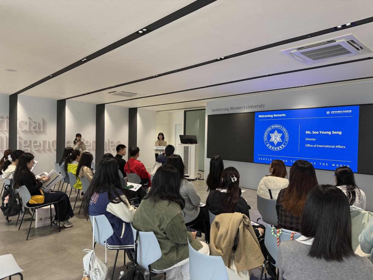 项目伊始,淑明女子大学为研习团举行了温馨的欢迎仪式。淑明女子大学国际处国际协力组&留学生服务组组长宋秀英对师生们的到来表示热烈欢迎,并详细介绍了未来几天的学习安排与体验计划。她鼓励同学们在课程学习中多感受、多体会,真正融入校园氛围,深入理解韩国文化,收获充实而难忘的交流经验。